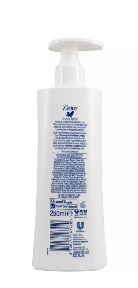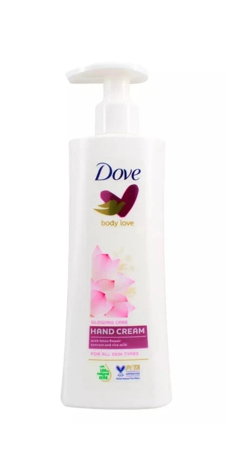 Product Description: At Dove, we believe in Body Love That means caring for our bodies and showing them some love, no matter how we are feeling about them. Give your hands a luxurious treat with Dove Glowing Care Hand Cream. This delicate formula blended with rice milk nourishes your skin deeply while its sparking floral scent delights your senses. And the result? Radiant looking hands that feel silky soft.